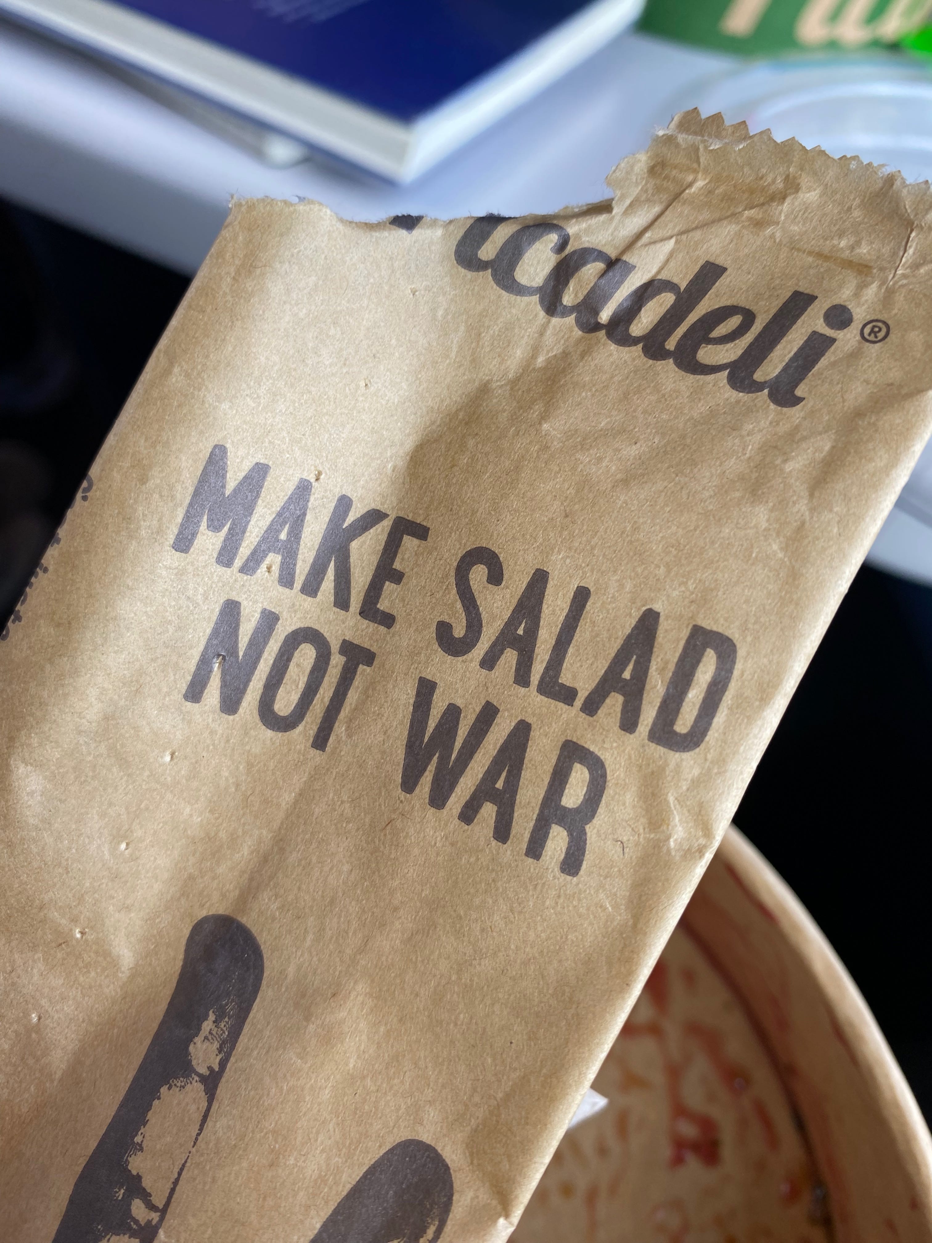 The train slows down: we’re delayed. Everyone has their own way to pass the time. A well-dressed man watches TikToks. He only ever pauses on ones about football, flicks away the rest. A woman watches a TV show on an iPad. It looks vaguely medical. Lots of young people have laptops out, typing away. A man in army camo carries a plastic bag with fizzy water and snacks. I’ll never get used to seeing the military stroll so casually about in Germany.